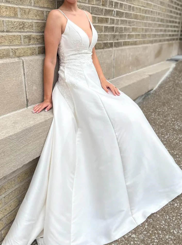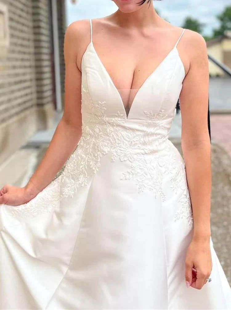 This elegant A-line satin wedding gown features delicate spaghetti straps and lace appliques that gracefully extend from the bodice to the top skirt, enhancing its sophisticated silhouette. The plunging neckline adds a modern touch, while the court train provides timeless elegance, perfect for a memorable bridal look.