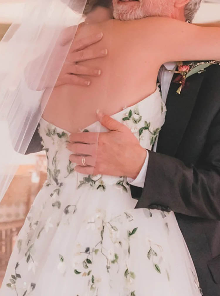Walk down the aisle in timeless elegance with this stunning A-line bridal gown. The sweetheart neckline frames the face beautifully, while delicate green embroidery adorns the tulle fabric for a touch of sophisticated color. The ruched bodice creates a flattering silhouette that transitions seamlessly into a graceful chapel train. Perfect for the modern bride seeking classic romance with an unexpected twist.