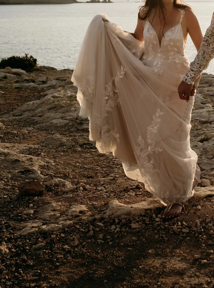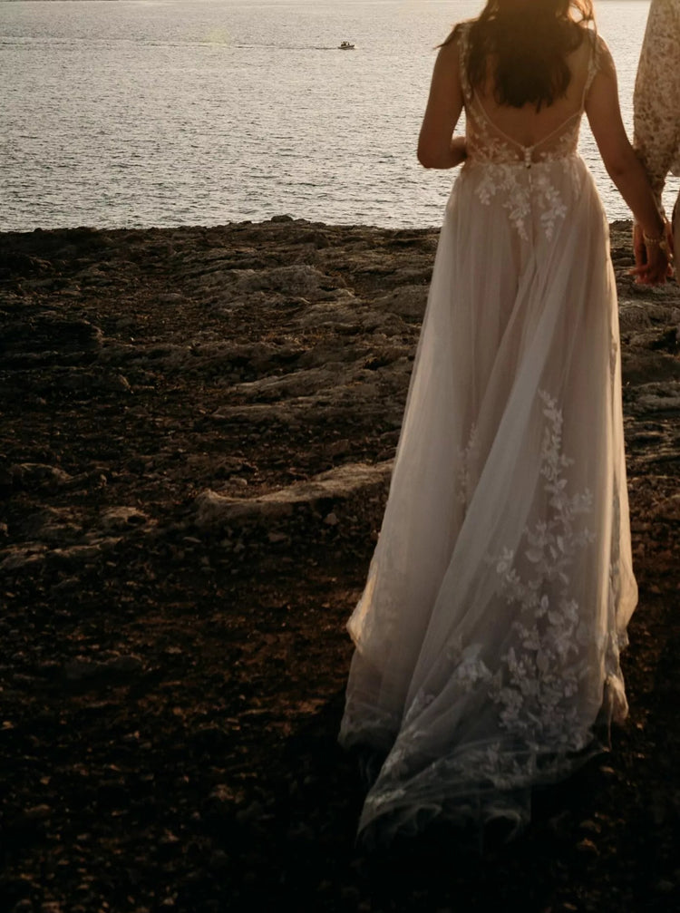 This A-line beach bridal dress features a mesh insert plunging neckline, edged with slim straps. Embroidered lace appliques embellish this destination wedding gown, crafted in tulle skirt, and finished with a sweep train. Covered buttons accent the low back.