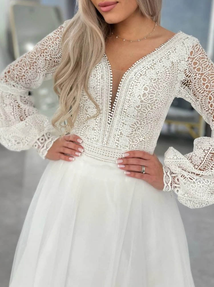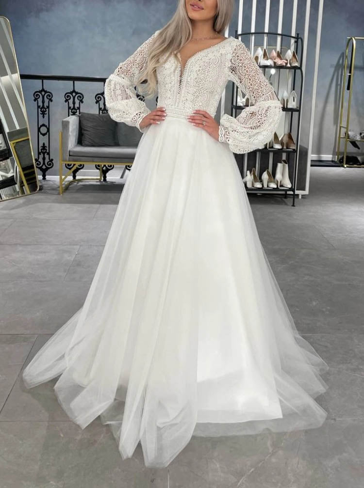 This elegant wedding gown features a lace bodice with a plunging neckline, perfectly complemented by bishop sleeves for a touch of vintage romance. The flowing tulle skirt enhances the bohemian aesthetic, offering lightweight comfort and graceful movement. Ideal for brides seeking a blend of classic craftsmanship and free-spirited style.
