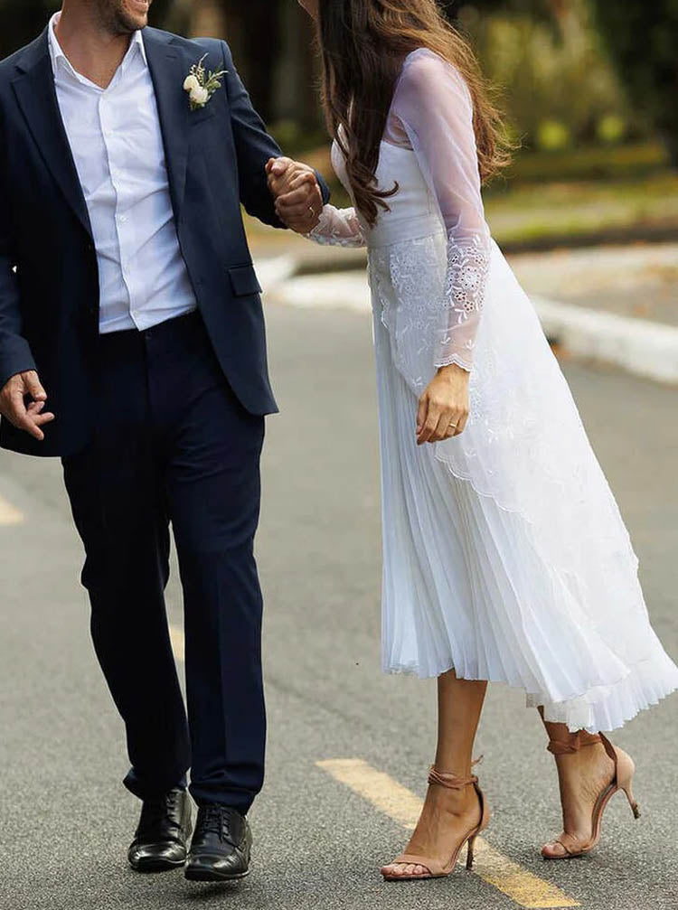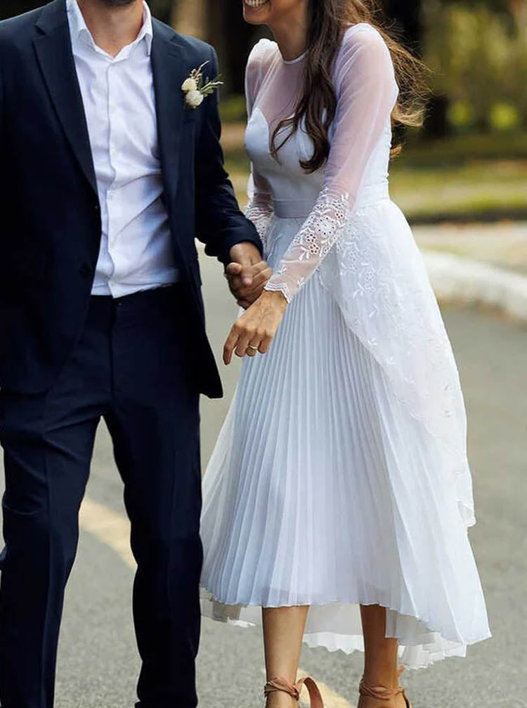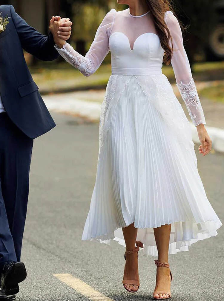 This casual tea-length wedding dress features elegant sleeves and a delicate illusion neckline, combining modesty with modern design. Crafted from pleated chiffon, the lightweight fabric flows gracefully, making it ideal for wedding receptions or semi-formal celebrations. The flattering silhouette ensures comfort and ease of movement while maintaining a refined, sophisticated look. Perfect for brides seeking understated elegance with subtle detailing. This wedding dress can be custom made with no extra cost.