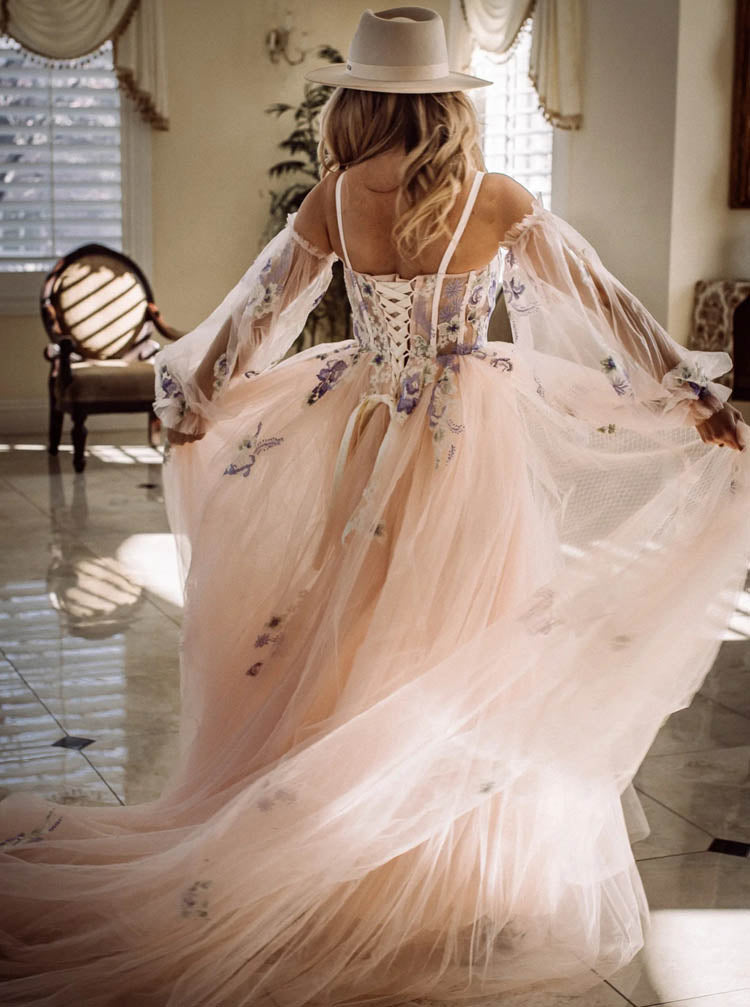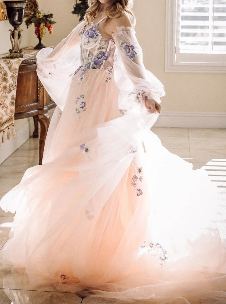 Detached Illusion Puff Sleeve Wedding Dress,Blushing Pink Wedding Gown,WD09281538