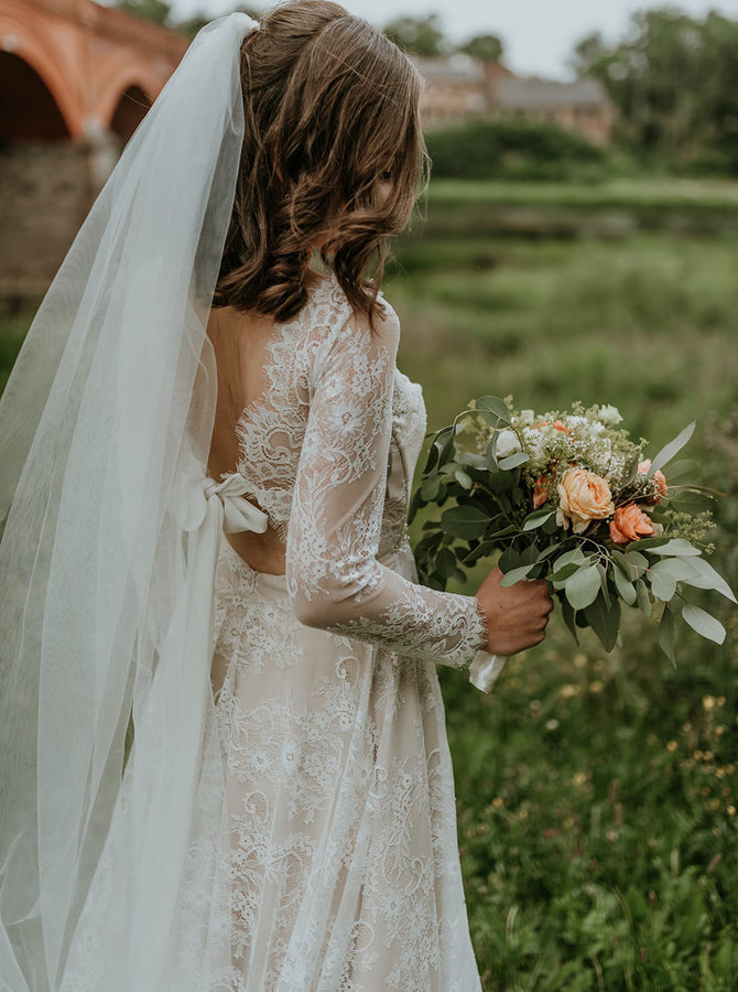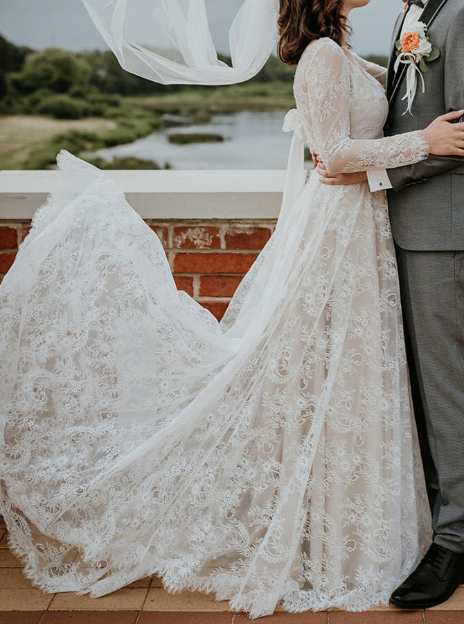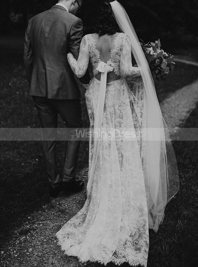 Lace Wedding Dress With Sleeve,Cutout Tie Back Destination Bridal Dress,WD00932