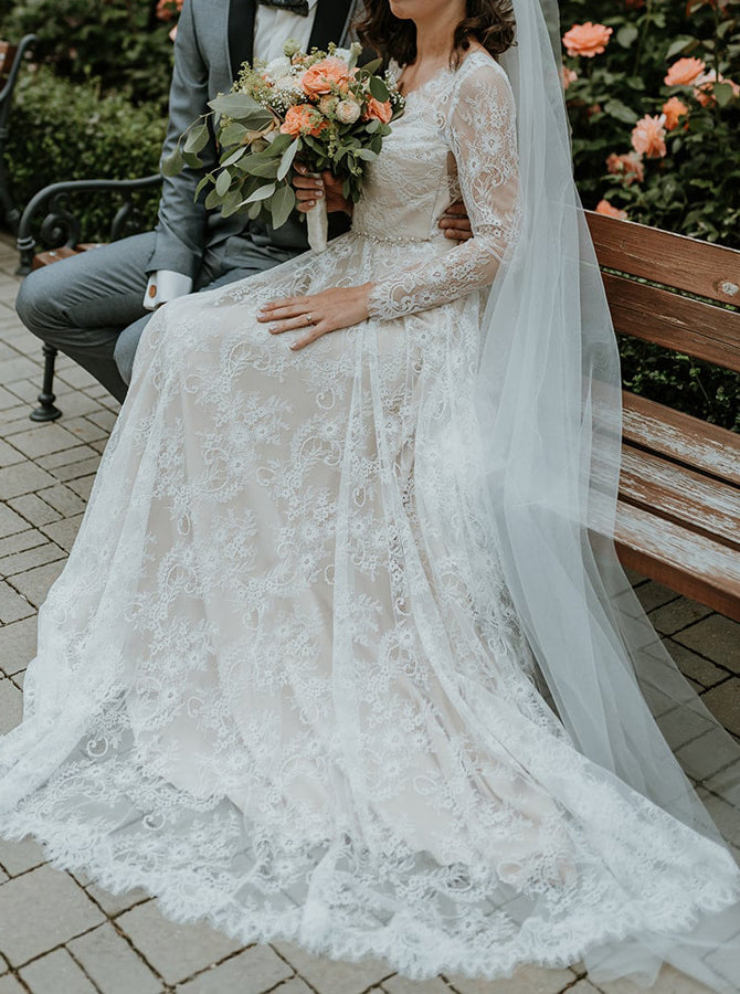 This exquisite lace wedding dress is perfect for your special day. The allover lace and long sleeves make the dress classic and elegant, while the cutout tie back adds a modern and chic touch. The sweep train provides a graceful look. The dress is perfect for a destination wedding.