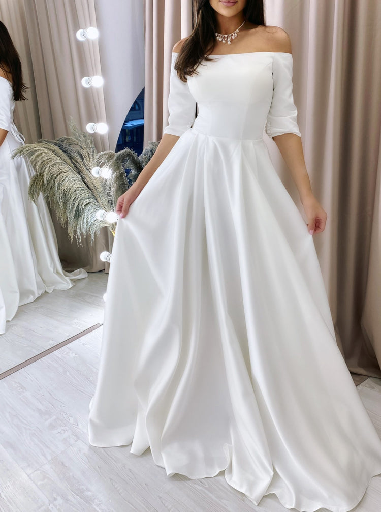 This elegant A-line wedding gown features a sleek satin finish that enhances its timeless appeal. Designed with graceful half-length sleeves and an off-the-shoulder neckline, it offers a flattering silhouette for any bride. The lace-up back allows a customized fit, ensuring comfort throughout your special day. Finished with a refined court train, this dress combines classic sophistication with modern details for a truly memorable look.