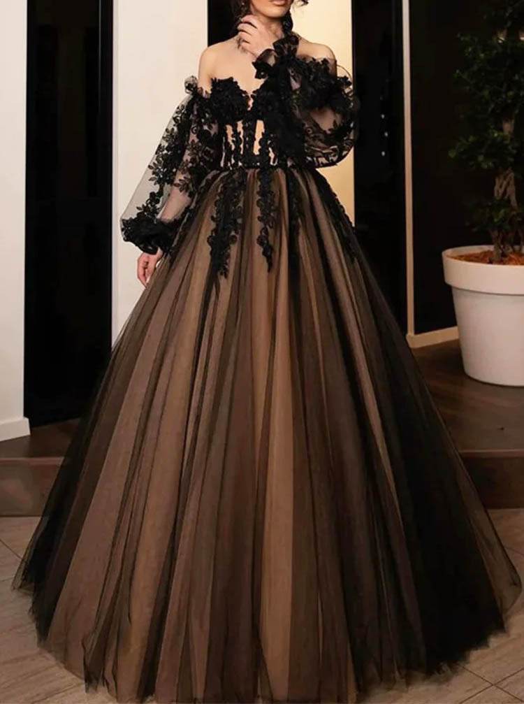 This bridal dress is crafted in black tulle over champagne, and features an A-line silhouette with a sweetheart neckline and sheer corset bodice. The floral appliques embellish the bodice and sheer bishop sleeves. This ethereal wedding gown is completed with a lace up back closure, a gathered floor length skirt.