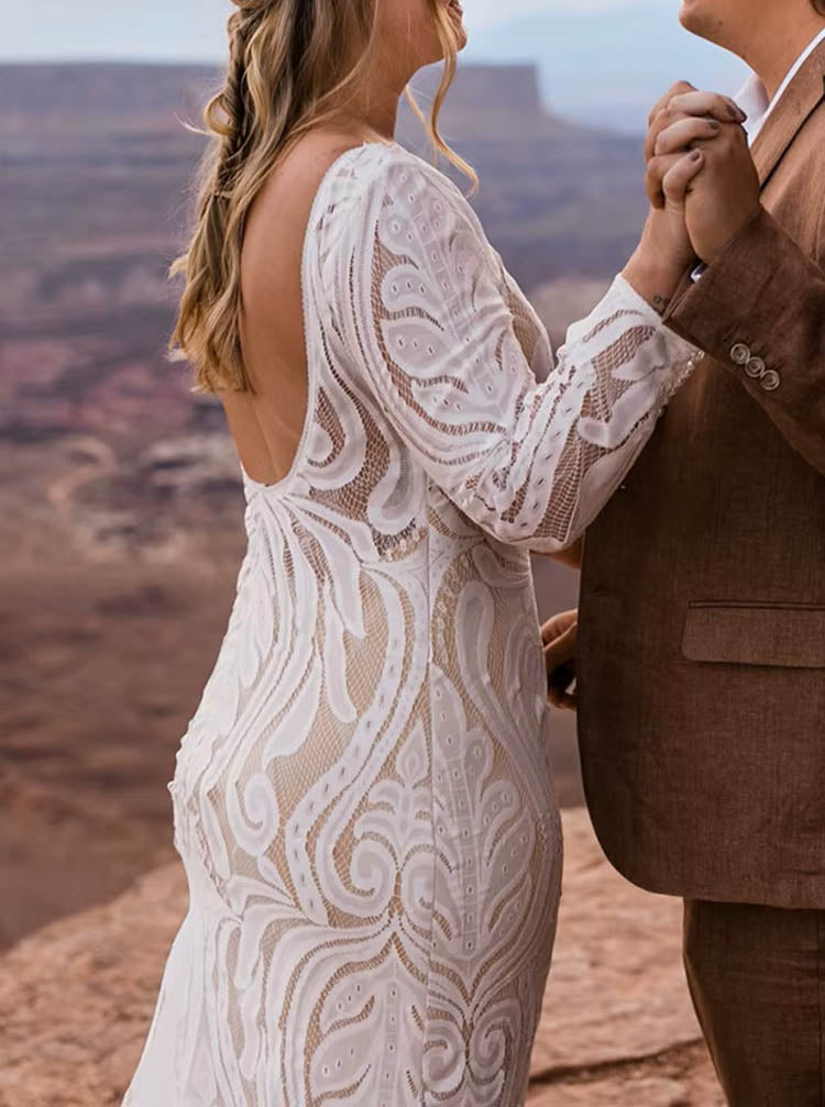 This exquisite lace wedding dress epitomizes refined bridal elegance with thoughtful design details. The bateau neckline delivers understated sophistication, complemented by long sleeves that provide graceful coverage and movement. The fit-and-flare silhouette is expertly tailored to enhance curves and create a flattering, feminine profile. An open back introduces a modern sensibility, offering an unexpected element of allure that photographs beautifully. The nude lining ensures optimal comfort and support, allowing you to move with confidence throughout your day. A sweeping train adds architectural drama and presence without sacrificing practicality. Engineered specifically for destination weddings, this dress combines formal refinement with travel-friendly construction—sophisticated enough for any venue while remaining versatile and manageable for varied wedding locations and celebrations.