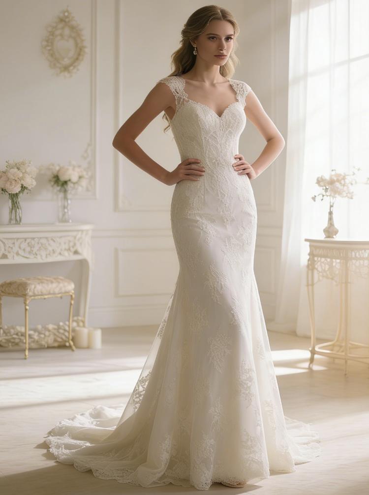 Feature:lace wedding dresses mermaid,lace wedding dresses sweetheart,lace wedding dresses trumpet. Beautifully classic trumpet bridal gown features opulent lace detail. Cap sleeves trumpet silhouette with allover lace bodice features illusion sweetheart neckline and open back. Sweep train. This lace wedding dress can be custom made with no extra cost.