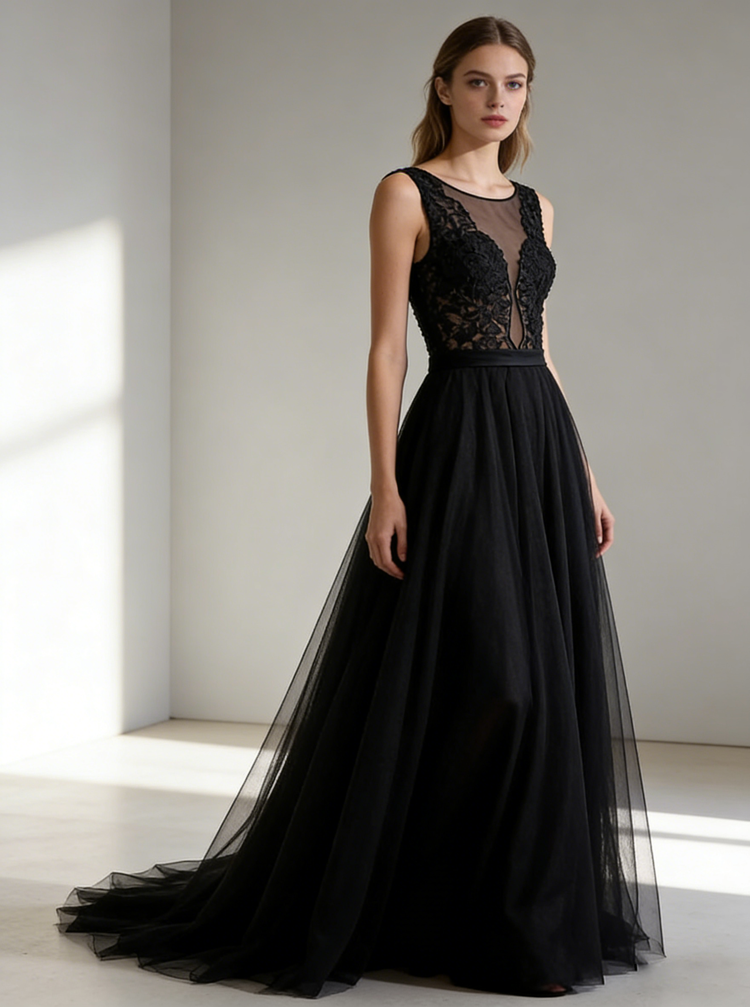 Feature:princess wedding dresses,black wedding dress long elegant,tulle wedding dresses with train. This black A-line wedding dress is perfect for a relaxed country wedding. Stunning wedding dress features illusion neckline sleeveless lace bodice topped by A-line tulle skirt. This black wedding dress can be custom made with no extra cost,lace up back or zipper back are all available.