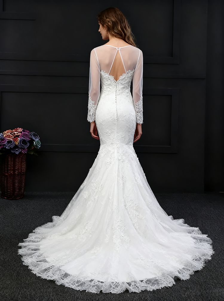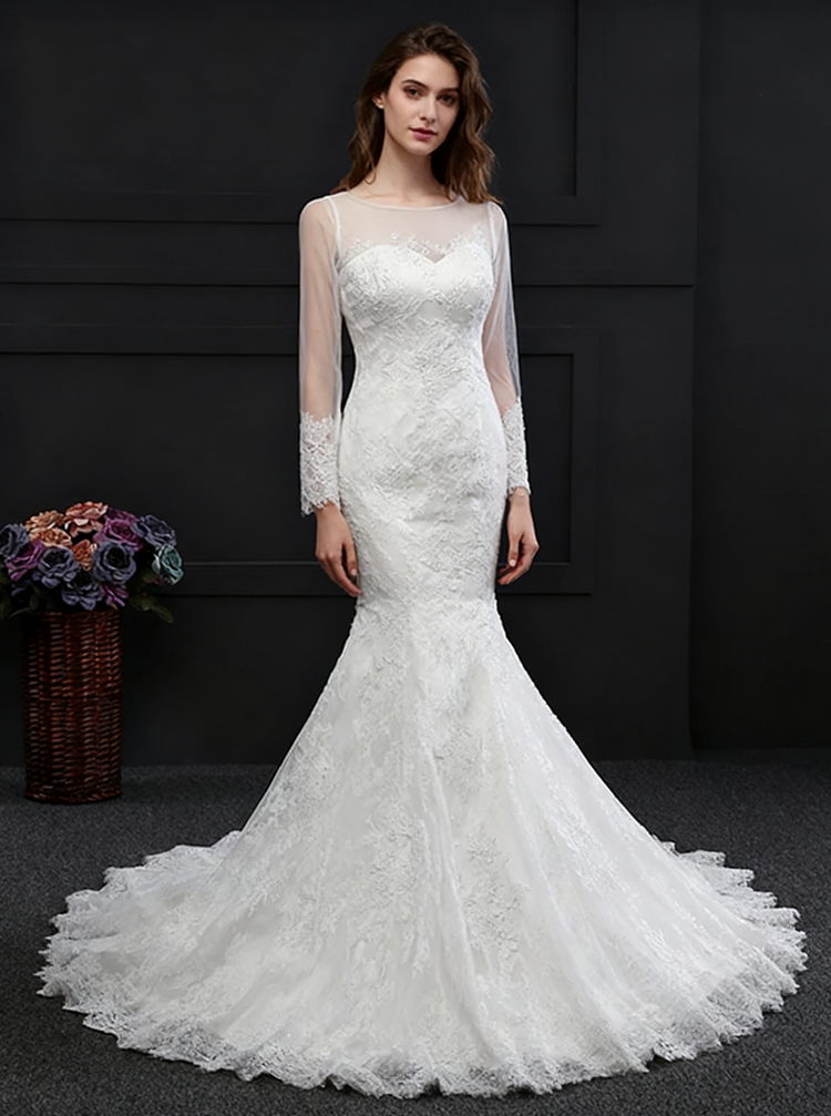 This elegant white lace wedding dress features alluring sheer round neckline, delicate illusion long lace sleeves, gorgeous chapel train scattered on the floor, and demure as well as modest illusion long lace sleeves. This fit and flare wedding dress can be custom made with no extra cost.