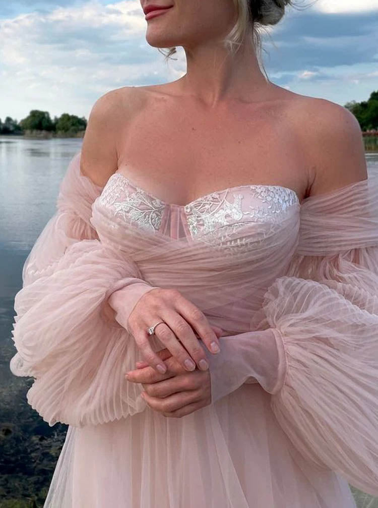 This exquisite wedding gown features a pleated bodice and sleeves that flow into elegant puff sleeves, enhanced by delicate lace appliques adorning the sweetheart neckline. The voluminous tulle skirt complements the romantic silhouette, while the lace-up closure ensures a perfect fit. Finished with a graceful chapel train, this off-the-shoulder pink dress combines timeless craftsmanship with subtle, modern details for a memorable bridal look.