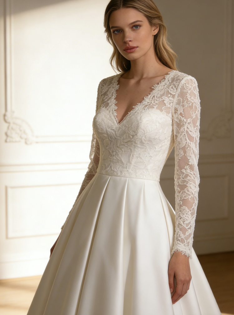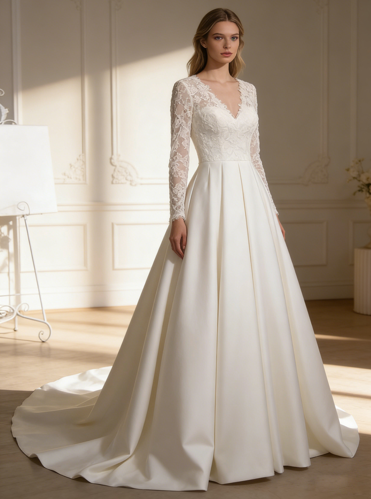 Feature:simple wedding dresses with sleeves,vintage wedding dresses with sleeves,plus size wedding dresses ivory. Vintage formal wedding dress, A-line silhouette adds accents whilst V-neckline and illusion long length sleeves create drama, sweep train satin skirt. This A-line wedding dress can be custom made with no extra cost.