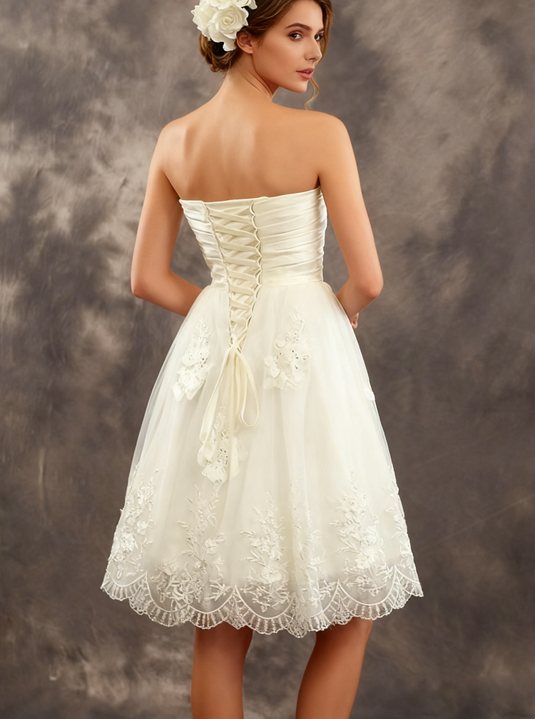 This knee-length reception dress showcases a romantic sweetheart neckline that elegantly frames the décolletage. Intricate lace appliqués cascade across the bodice and skirt, creating sophisticated visual interest and dimension. The structured corset back provides exceptional support and a refined silhouette, while allowing for graceful movement. Customizable in tea length, knee length, or any preferred length, this dress adapts to your specific needs and venue requirements. The combination of delicate lace detailing and architectural corset construction delivers both femininity and confidence. An ideal choice for brides seeking a polished, contemporary reception look with timeless appeal.