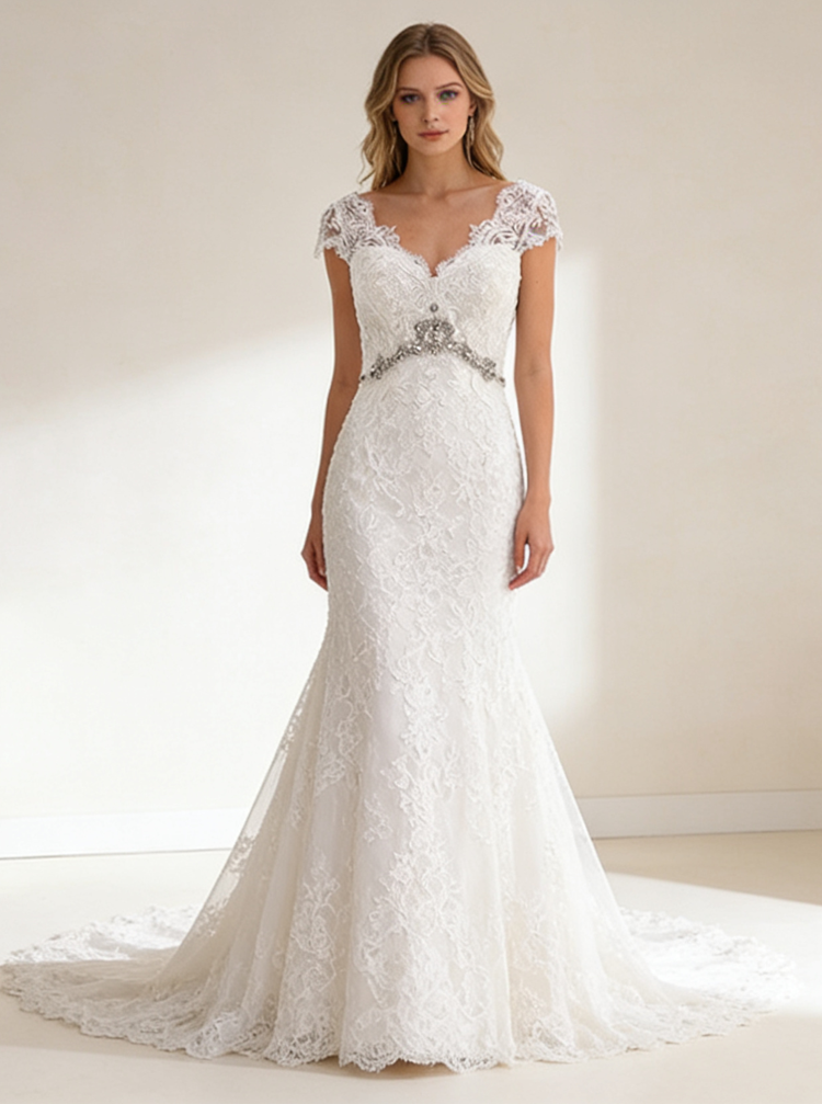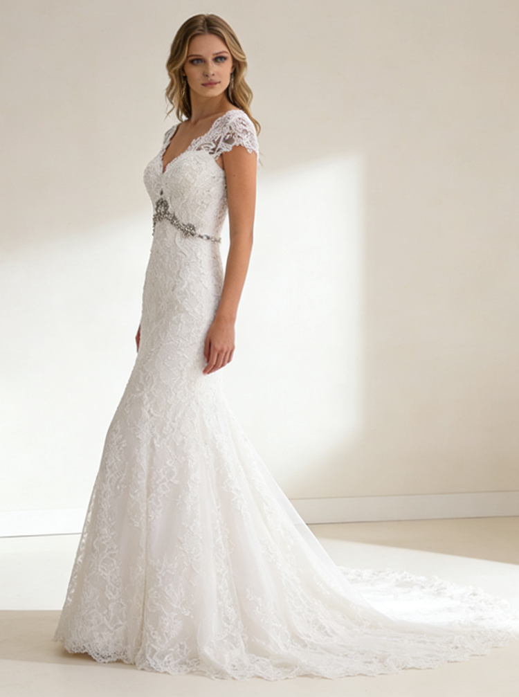 This exquisite mermaid wedding dress combines sophisticated design elements for the modern bride seeking timeless appeal. Cap sleeves provide elegant coverage while a refined V neckline creates a flattering, elongated silhouette. Hand-beaded detailing at the waist adds luxurious dimension and catches light beautifully throughout your celebration. Sheer lace layering enhances the gown's romantic aesthetic and vintage-inspired character. The distinctive illusion back, adorned with delicate buttons, offers an alluring detail for ceremony moments and photographs. Completed by a chapel-length train, this gown delivers the graceful drama and polished elegance expected of a premium bridal piece.