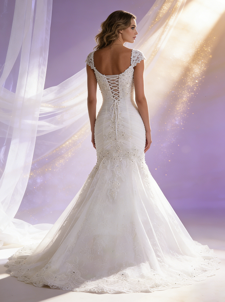 Feature:princess wedding dresses with straps,wedding dress long elegant,modest wedding dress. Lace up back, tulle over satin trumpet wedding dress with cap sleeves. This trumpet bridal gown features ruched bodice with jeweled appliques accents and court train. This mermaid wedding dress can be custom made with no extra cost,lace up back or zipper back are all available.