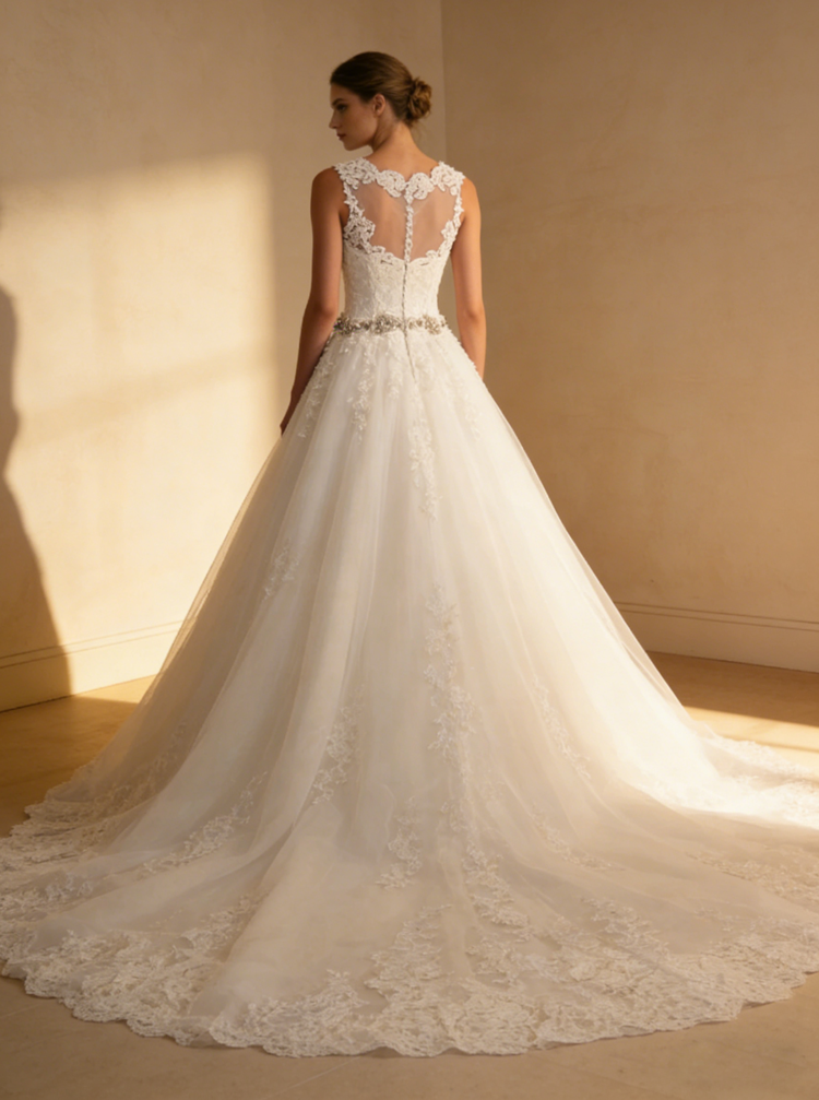 Feature:princess wedding dresses romantic,lace princess wedding dresses,lace wedding dresses classic. This classic white lace, satin and tulle wedding dress features lace bodice with illusion neckline and sheer back adorned with button closure, and A-line silhouette. This classic wedding dress can be custom made with no extra cost,lace up back or zipper back are all available.