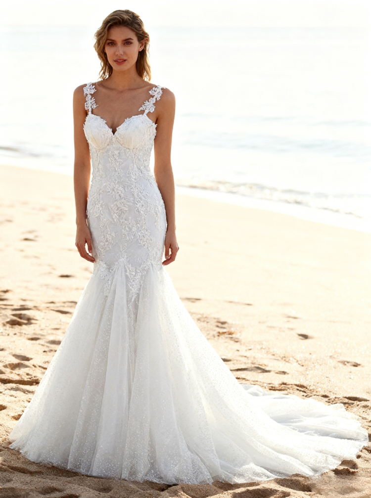 Trendy Mermaid Dresses with Straps,Embroidered Wedding Gown,White Wedding Gown,WD00038