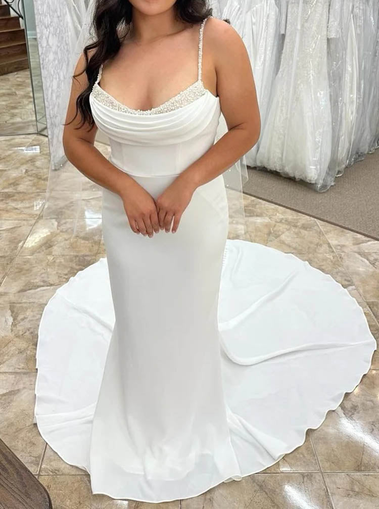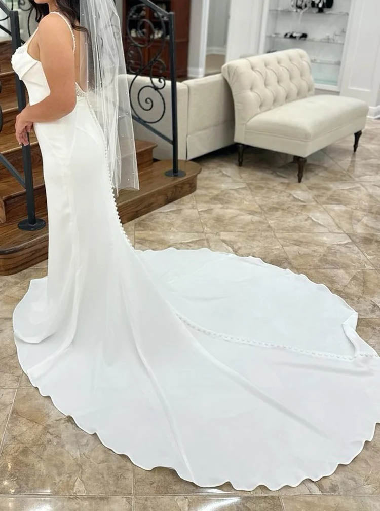 This elegant fit and flare wedding dress features delicate chiffon fabric that softly skims the figure. The beaded curved neckline adds subtle sparkle while spaghetti straps offer a graceful, minimal silhouette. A chapel-length train enhances the gown’s romantic appeal, complemented by covered buttons that trail down the hem for refined detail. Designed to combine classic charm with modern sophistication, this bridal dress ensures a confident and timeless look on your special day.