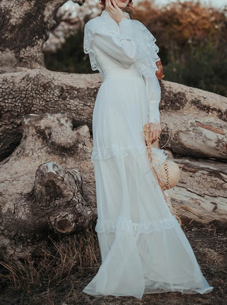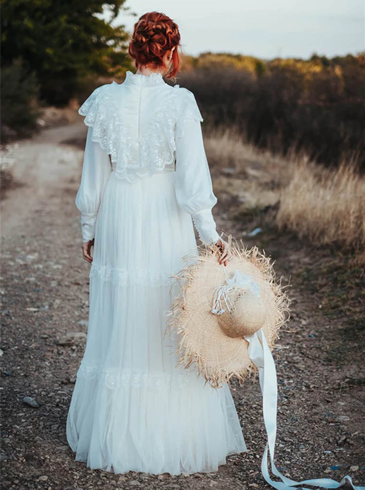 This vintage-inspired wedding dress features a sophisticated flounce lace top with a high neck and long sleeves finished with elegant buttoned cuffs. Complemented by a floor-length tulle skirt, it offers a graceful silhouette perfect for destination weddings or classic ceremonies. The delicate lace and flowing tulle combine to create a timeless and refined bridal look.