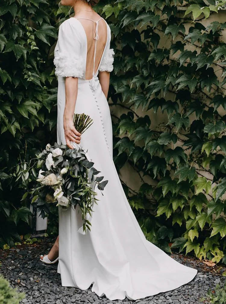 This fit and flare ivory bridal gown features a v neckline, an open back with a thin strap. Three-dimensional floral appliques embellish the half length sleeves, finished with a thigh-high slit and a court train.