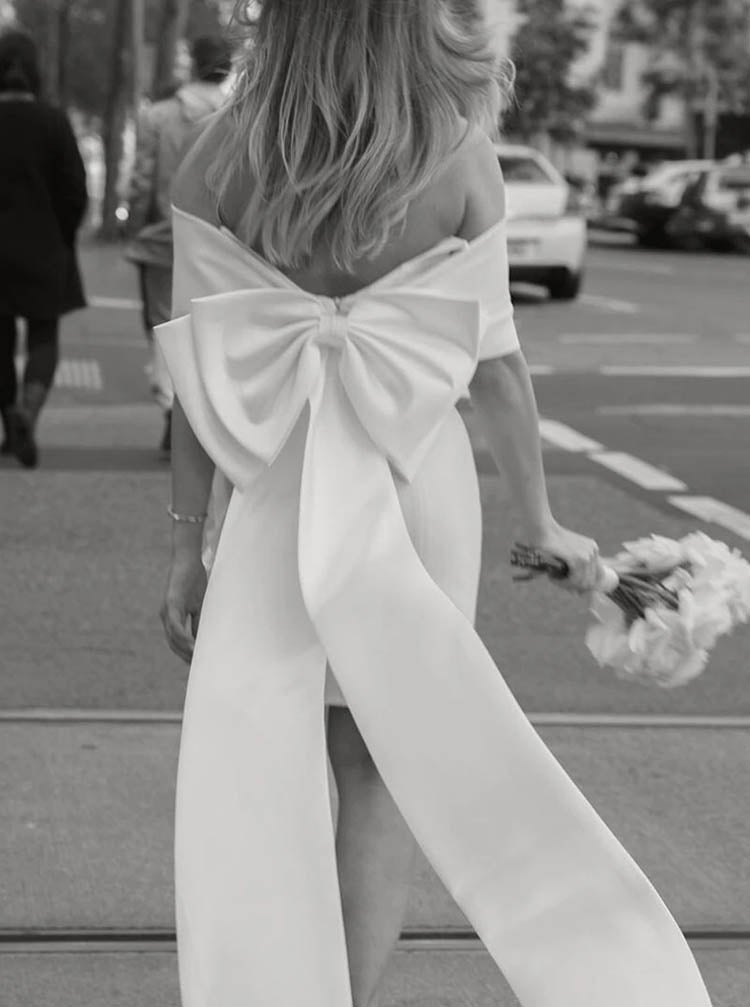 This elegant off-the-shoulder wedding dress features a sophisticated twisted knot neckline that frames the shoulders beautifully. The fitted bodice transitions into a ruched mini skirt, creating a flattering silhouette perfect for modern brides. The standout detail—an oversized bow at the back with floor-sweeping streamers—adds dramatic flair and movement. Ideal for intimate ceremonies, receptions, or rehearsal dinners, this dress combines contemporary design with timeless romance, ensuring you'll make a memorable entrance.