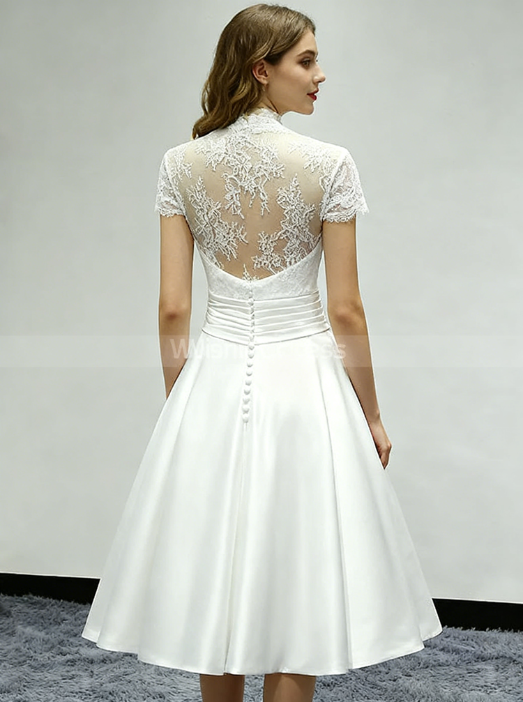 Feature:vintage wedding dresses with sleeves,short wedding dresses with sleeves,simple wedding dresses fall. Featuring demure short sleeves and knee length skirt, feminine lace bodice and satin skirt, this short elegant wedding dress will make you the eye-catcher without doubts. This vintage wedding dress can be custom made with no extra cost.