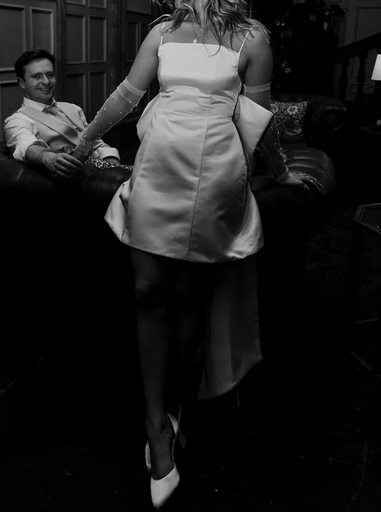 Elevate your wedding reception with this sophisticated short satin dress, designed for the modern bride seeking elegance without formality. Delicate spaghetti straps frame the shoulders while the luxurious satin fabric drapes beautifully, creating a refined silhouette. The showstopping oversized bow at the back adds a dramatic flourish, transforming this mini-length piece into a statement-making ensemble. Perfect for receptions, rehearsal dinners, or intimate ceremonies, this dress combines timeless charm with contemporary style for an unforgettable celebration.