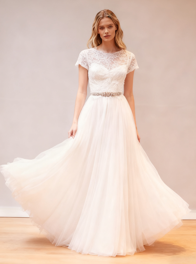This stunning A-line wedding dress showcases refined bridal elegance with thoughtful design details. The intricate lace bodice features flattering short sleeves, while the voluminous tulle skirt creates a classic silhouette that flatters all body types. A delicate beaded belt cinches the waist, adding sparkle and definition to your frame. The dramatic V-back design offers a sophisticated reveal, perfect for showcasing your shoulders and back. The brush train provides graceful movement without overwhelming your silhouette. Ideal for both traditional and modern celebrations, this gown combines timeless romance with contemporary style, ensuring you feel confident and radiant on your wedding day.