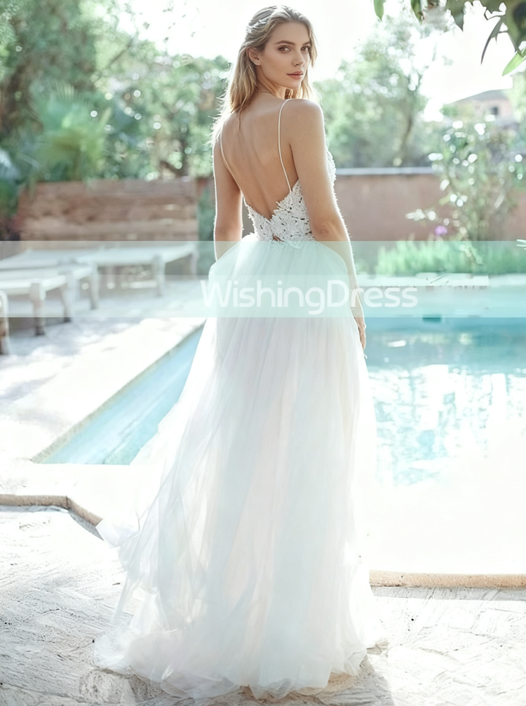 Tulle Wedding Dress with Spaghetti Straps,Floor Length Beach Wedding Dress,WD00454
