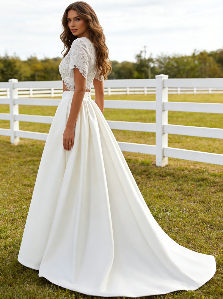 Feature:satin wedding dresses with sleeves,two piece wedding dresses,wedding dresses unique. Beautiful ivory satin A-line wedding dress with delicate lace bodice with short sleeves. This two piece wedding dress can be custom made with no extra cost.